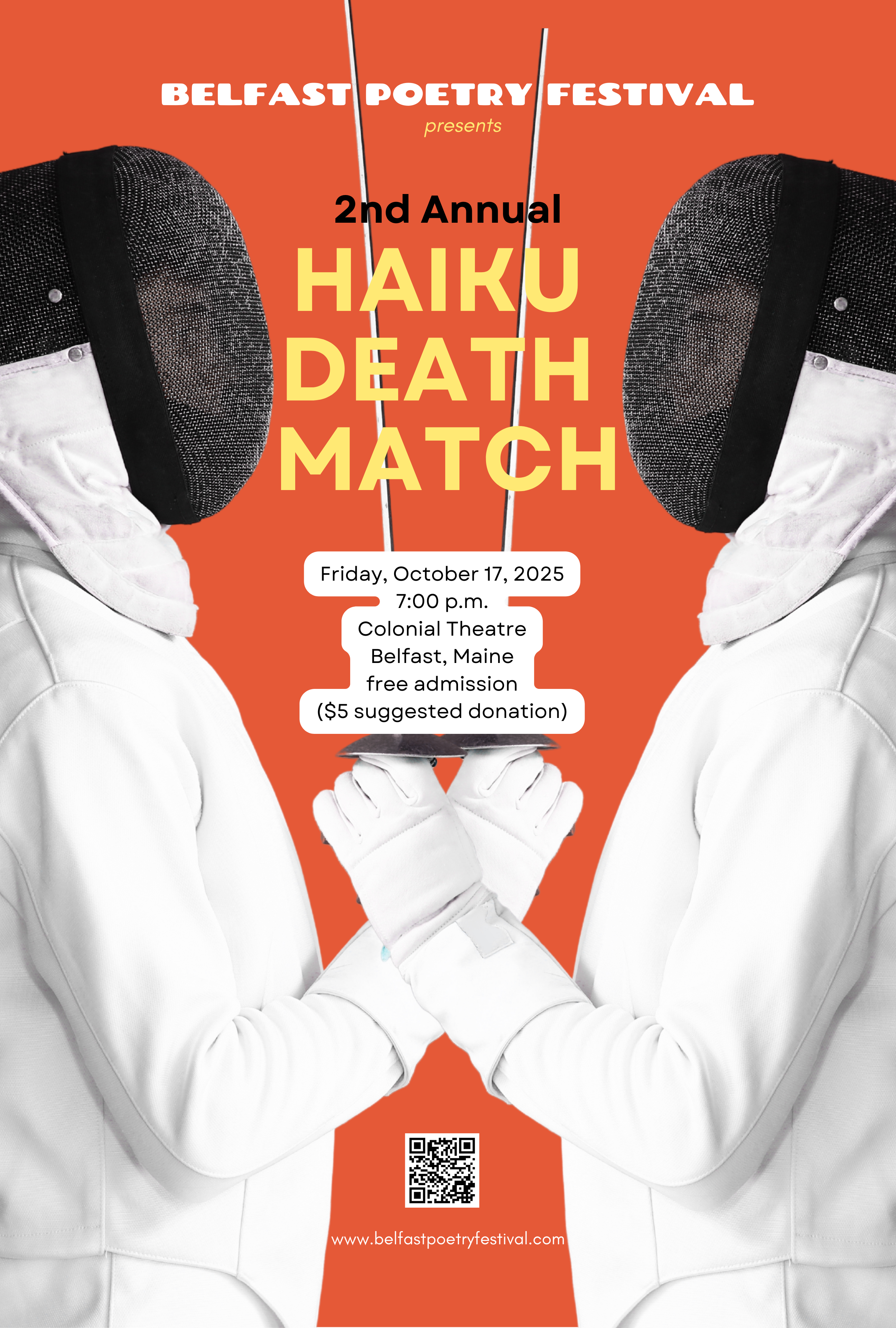 This tournament-style live haiku showdown was a hit last year, so the Belfast Poetry Festival is bringing it back to the Colonial Theatre for a 2nd annual competition! Host Mattie Bamman will emcee, and audience participation will determine both the prompts for the haikus and the winner of each head-to-head battle. Last competitor to remain standing will be declared the Haiku Master, and prizes and celebration will ensue!